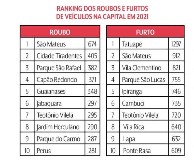 A análise feita pela reportagem em 91 distritos policiais da capital revela que o bairro líder de roubos de veículos é São Mateus, na Zona Leste, região onde 674 veículos foram levados com emprego de violência, muitas vezes com os criminosos usando armas para intimidar suas vítimas.